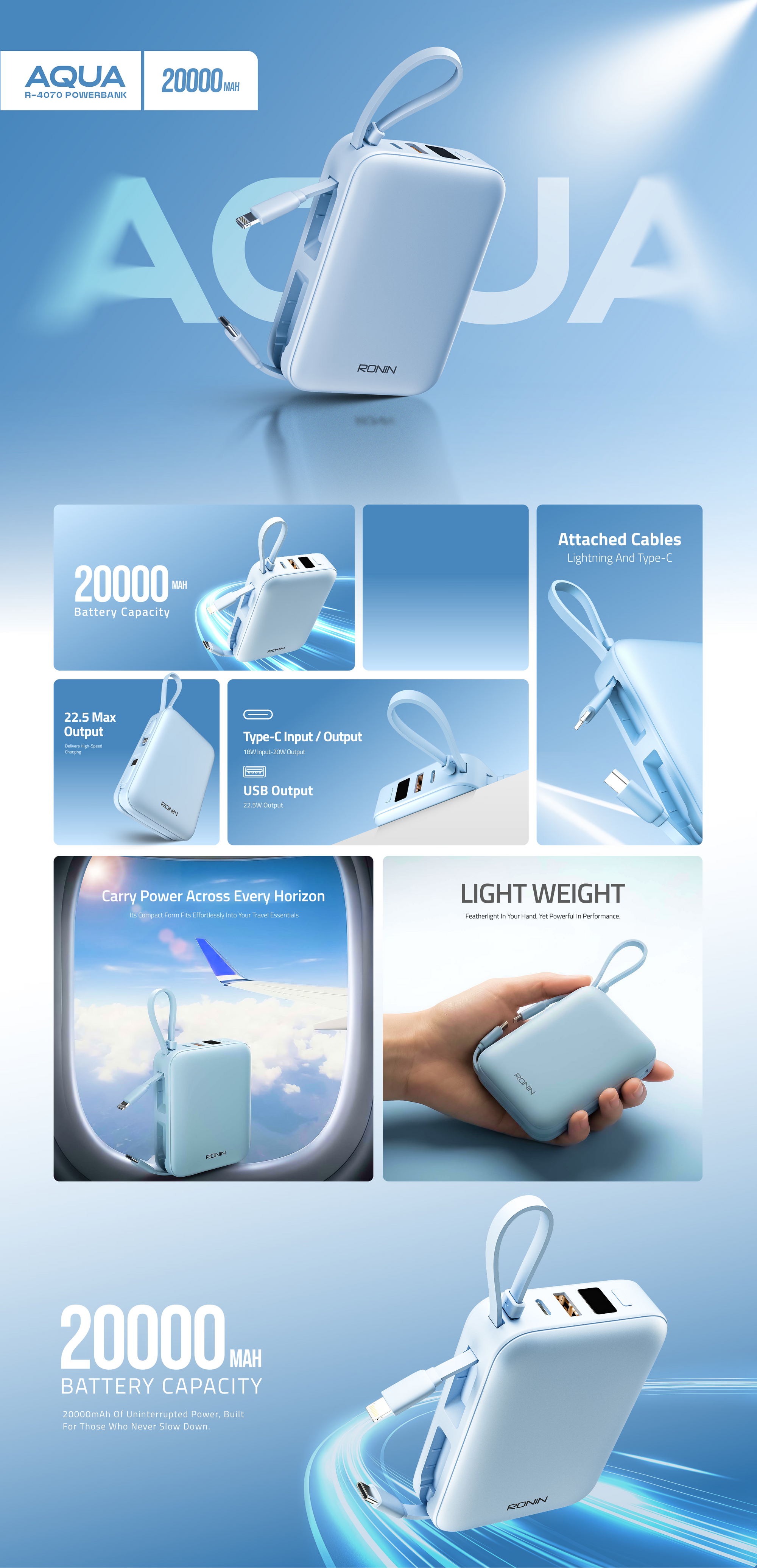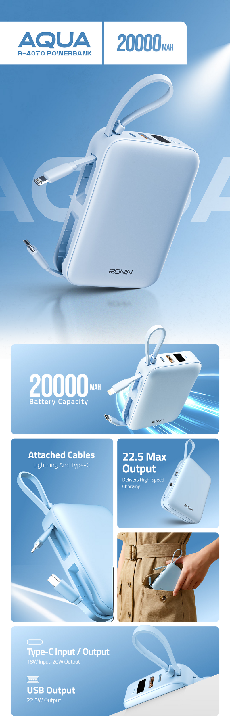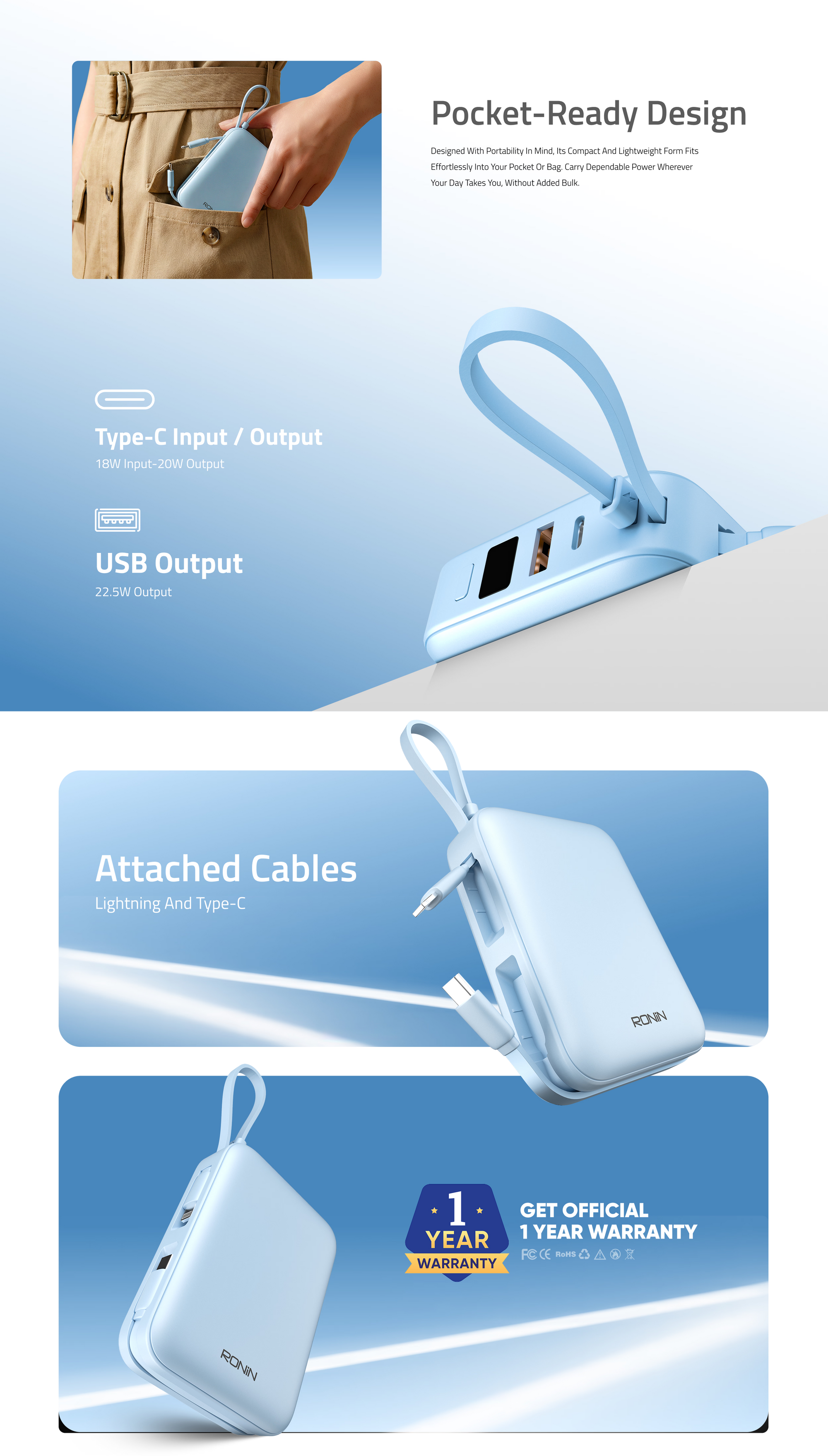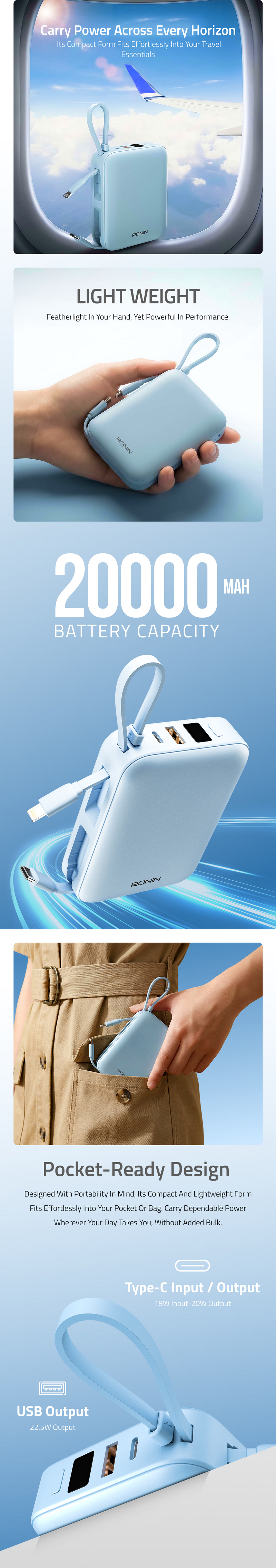 This high-capacity power bank is designed for users who need long-lasting power with a clean, premium look. Featuring a matte soft-touch finish in a pearl white tone, it feels smooth in hand while maintaining a modern and minimal aesthetic. With a 20000 mAh capacity and a rated output of 12,800 mAh, it delivers reliable, all-day charging for smartphones, iPhones, earbuds, and other tech gadgets. The Li-Polymer battery ensures enhanced safety and consistent performance, while fast charging up to 22.5W and multiple outputs—including USB-A, Type-C PD, and built-in Type-C and Lightning cables—allow you to charge multiple devices simultaneously. A digital display provides real-time battery status, and intelligent power distribution protects devices by automatically managing power flow, making it a dependable choice for daily use, travel, and extended days on the go.