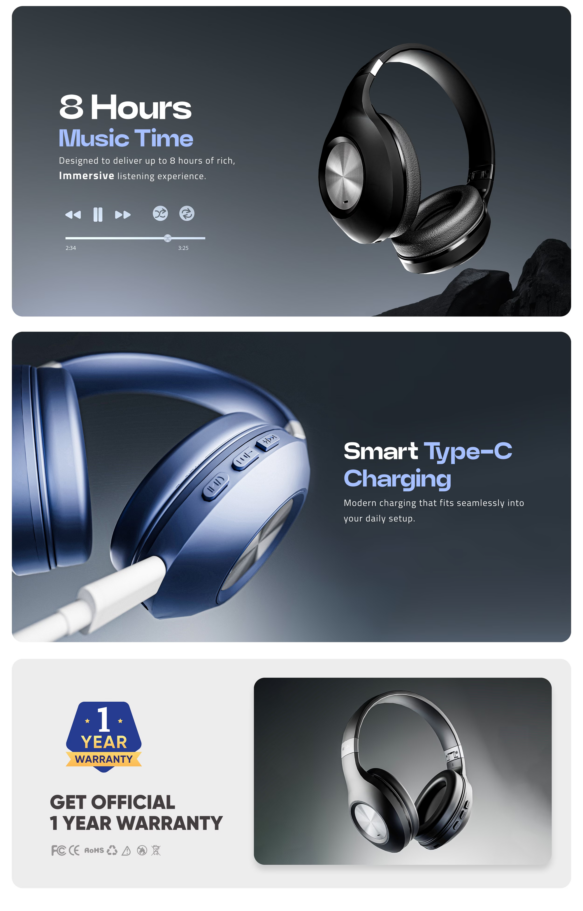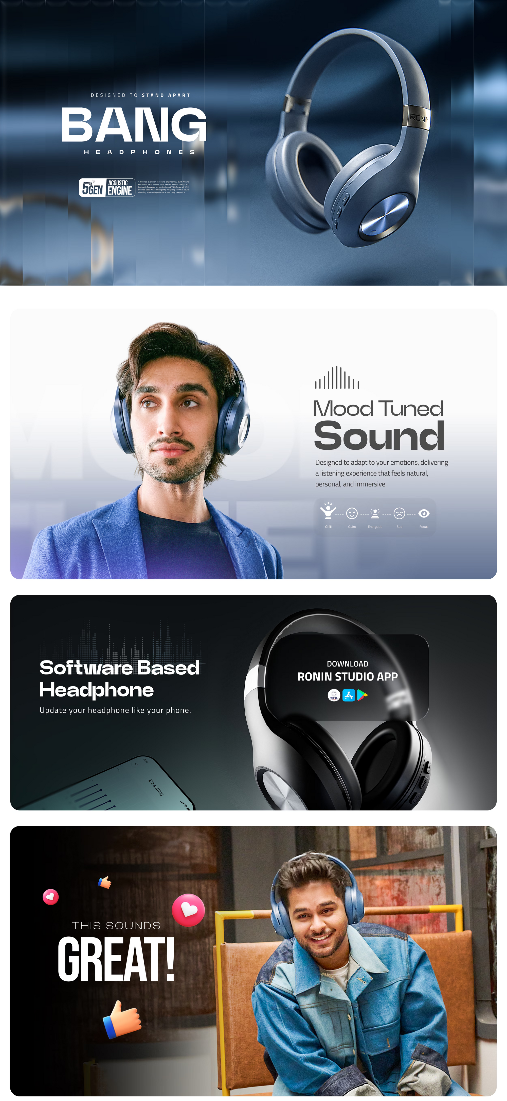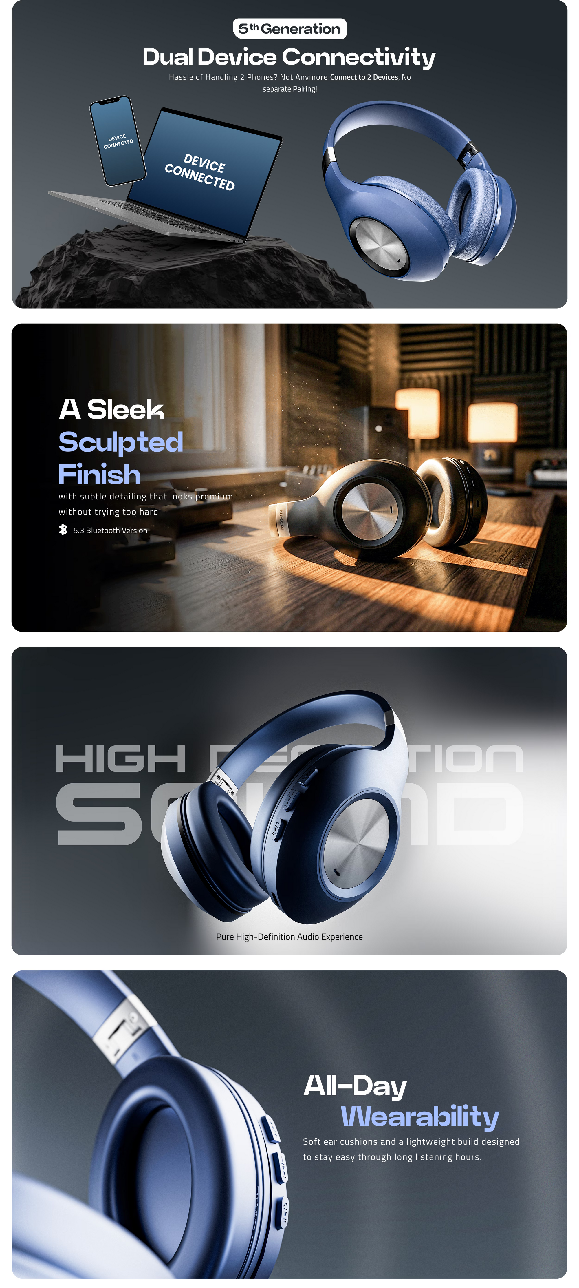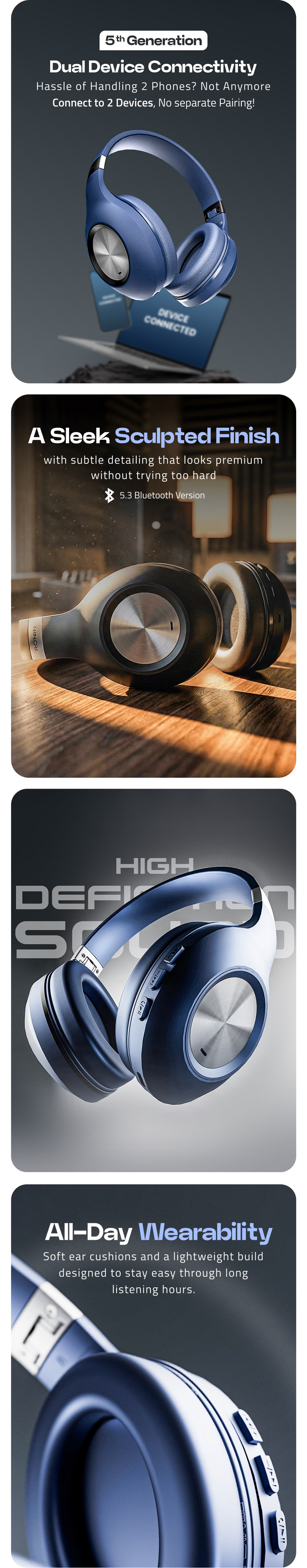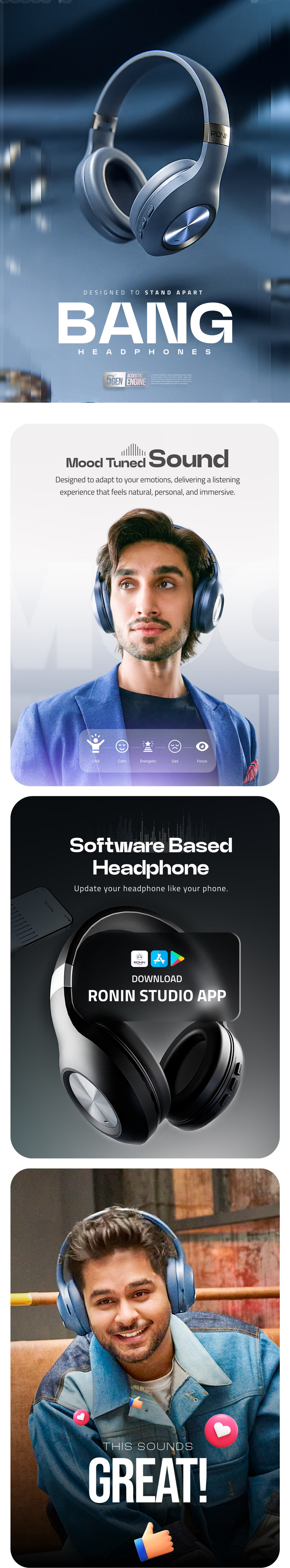 The Bang Headphones are a software-based, mood-tuned audio companion that adapts to your listening style and emotional context, delivering rich, balanced sound with clarity and depth, wherever you go. Designed for seamless daily use, R-1500 features dual device connection so you can stay connected to two devices at once and switch effortlessly between calls, music, and media; Bluetooth 5.4 ensures stable wireless connectivity up to 10 meters, compatible with both Android and iOS. With powerful 40 mm dynamic drivers tuned for immersive stereo sound, intuitive support for voice assistants like Siri and Google Assistant, and a comfortable over-ear fit, these headphones keep you listening longer. The long-lasting battery offers up to 10 hours of music playtime, with fast Type-C charging and reliable standby life. R-1500 also includes wired listening flexibility, smooth calling performance, and a refined design built for everyday use, backed by international certifications and a 1-year official warranty.
