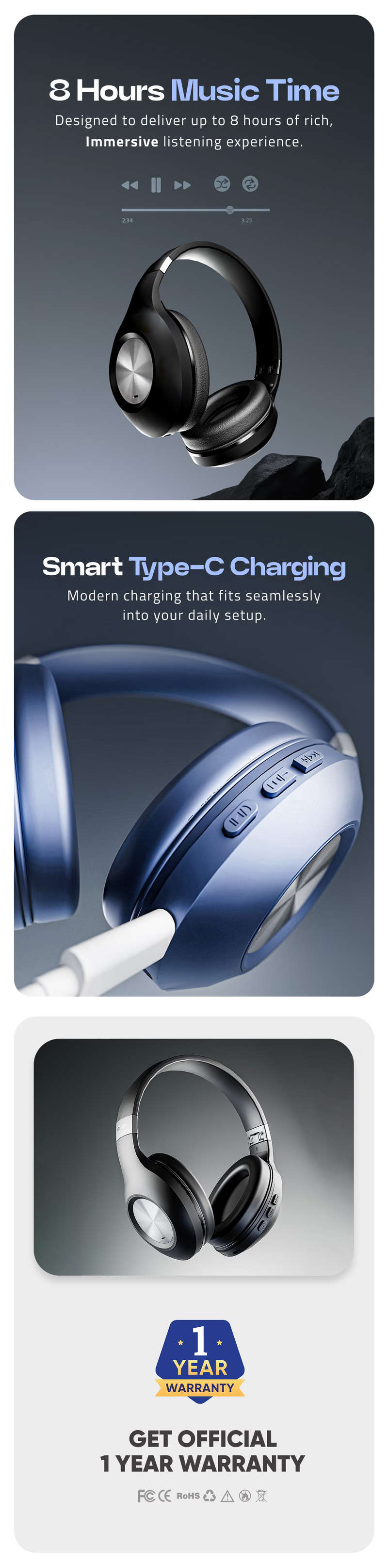| BATTERY CAPACITY | Enjoy Nonstop Music for Up to 8 Hours, Refueling Time: Up to 2 to 3 Hours, Modern Type-C Charging Compatibility, Smart LED Charging Signal, Long-lasting 200mAh Rechargeable Battery |