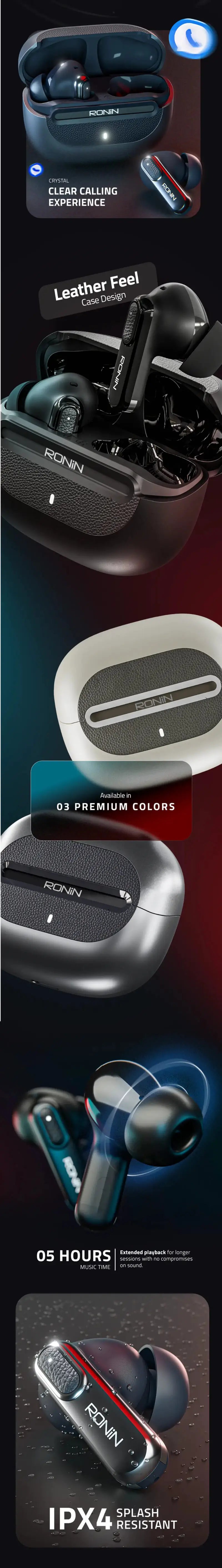 Finished with a premium leather-feel texture, the R-7080 NOX is all about refined design and rich performance. With 5 hours of music time, 80 hours of standby, and a 400 mAh case battery, it’s built to keep up. With Dual Connectivity, you can connect to two devices at once and shift between them effortlessly. Adaptive ANC (up to 25 dB) and Qnx™ ENC deliver focused listening and crystal-clear calls, while Aware Mode lets ambient sounds in when needed. The Ronin Studio app puts everything in your hands, from advanced EQ control to adjustable ANC and real-time software upgrades. Ergonomic, splash-resistant, and deeply customizable, NOX is engineered for those who expect more from everyday sound.