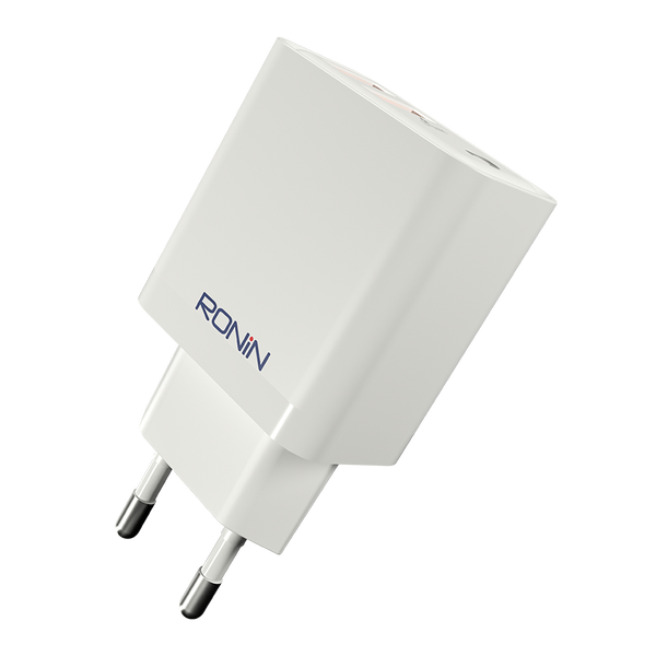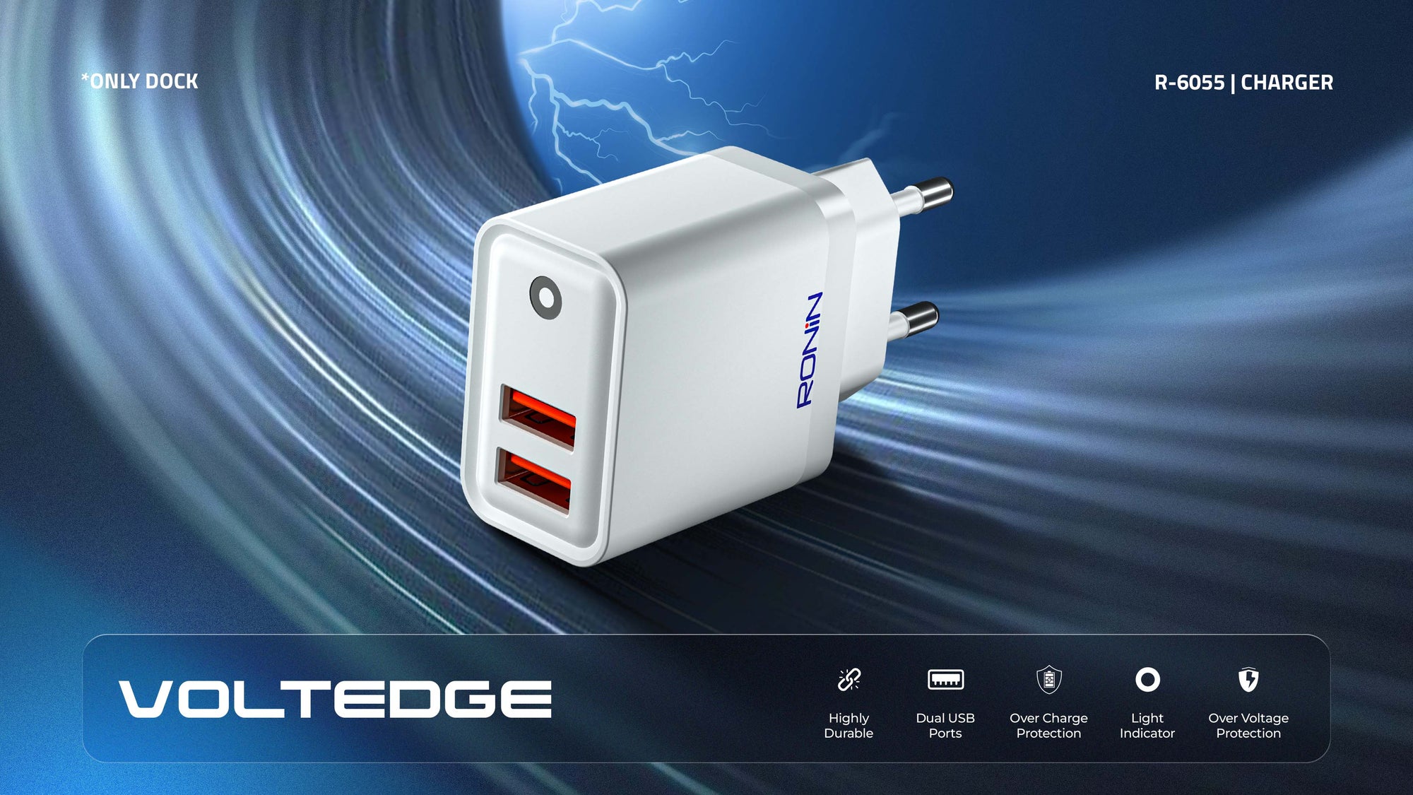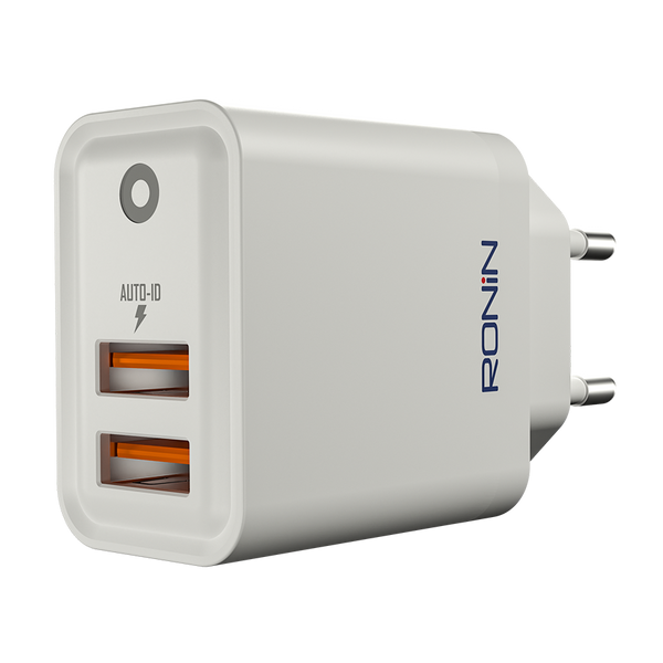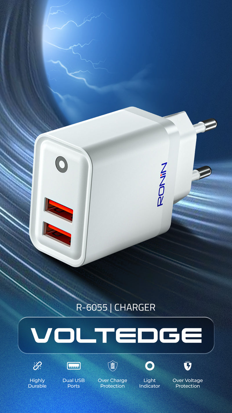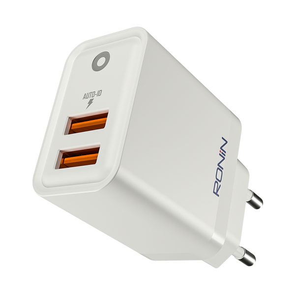 Ronin Voltedge (R-6055) is a reliable wall charger designed for simple and efficient everyday charging. Featuring Auto ID technology and dual USB ports, it intelligently distributes power to charge multiple devices simultaneously with a total output of 2.4A at 5V, making it suitable for smartphones, iPhones, tablets, earbuds, and other USB-powered devices. Built using durable, fire-resistant ABS + PC material, it includes essential safety protections such as short circuit prevention, overcharge protection, surge protection, temperature control, and anti-rust connectors. With its compact and elegant white design, smooth edges, and durable prongs, the Voltedge charger is ISO 9001 and UKAS certified, backed by a 1-year warranty, and comes with the charger included in the box.