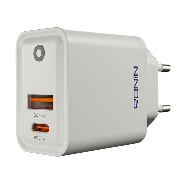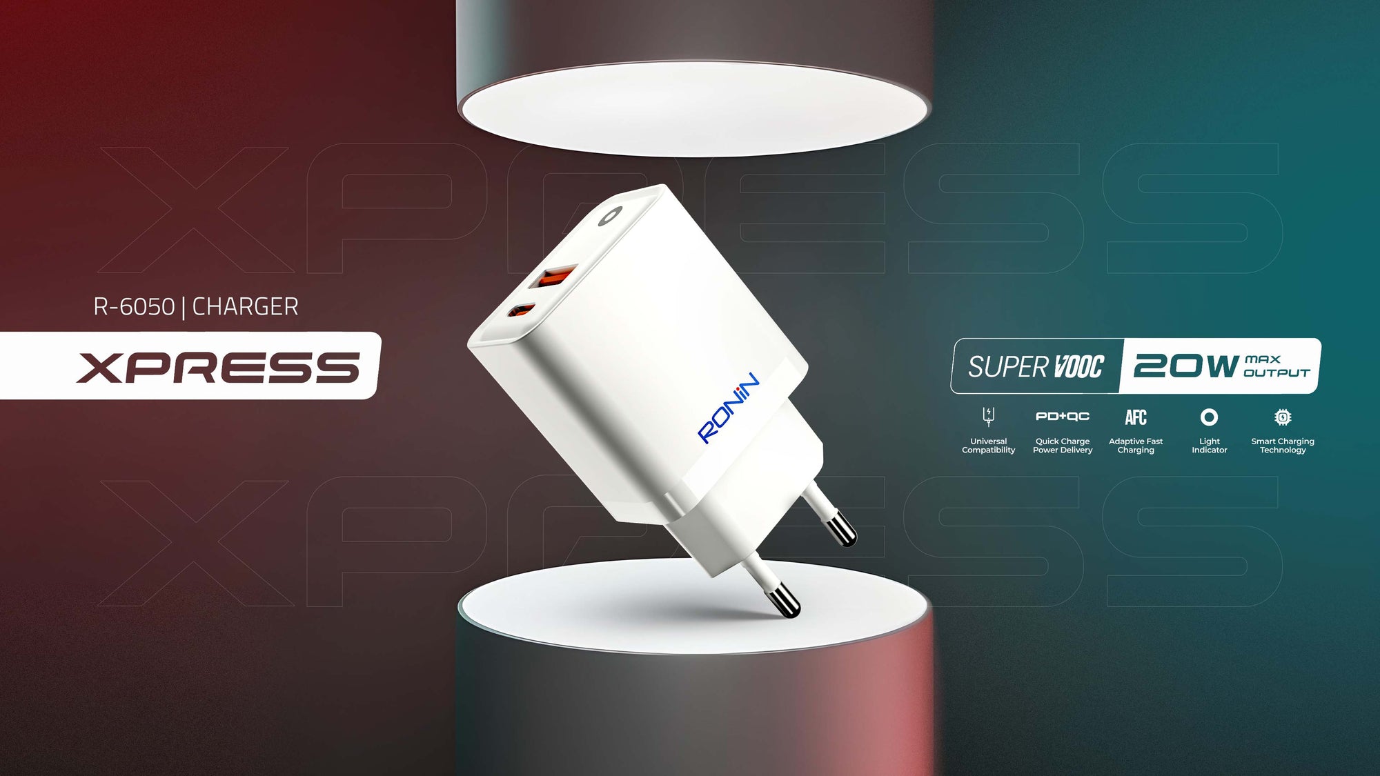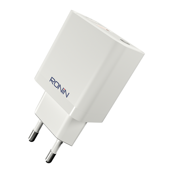 Ronin Xpress (R-6050) is a compact and dependable wall charger designed for efficient and versatile everyday charging. Built with Standard 2.4A technology, it features PD and Micro USB output ports with a total output of QC 18W and PD 20W, supporting multiple charging protocols including PD, QC, AFC, VOOC, and SUPERVOOC for broad device compatibility. Delivering a 5V output profile, it is suitable for smartphones, iPhones, tablets, earbuds, and other USB-powered devices. Crafted from durable, fire-resistant ABS + PC material, the charger includes advanced safety features such as short circuit prevention, overcharge protection, surge protection, temperature control, and anti-rust connectors. Finished in a clean white color with smooth edges, premium finish, and durable prongs, the R-6050 is ISO 9001 and UKAS certified, comes with a 1-year warranty, and includes the charger in the box.